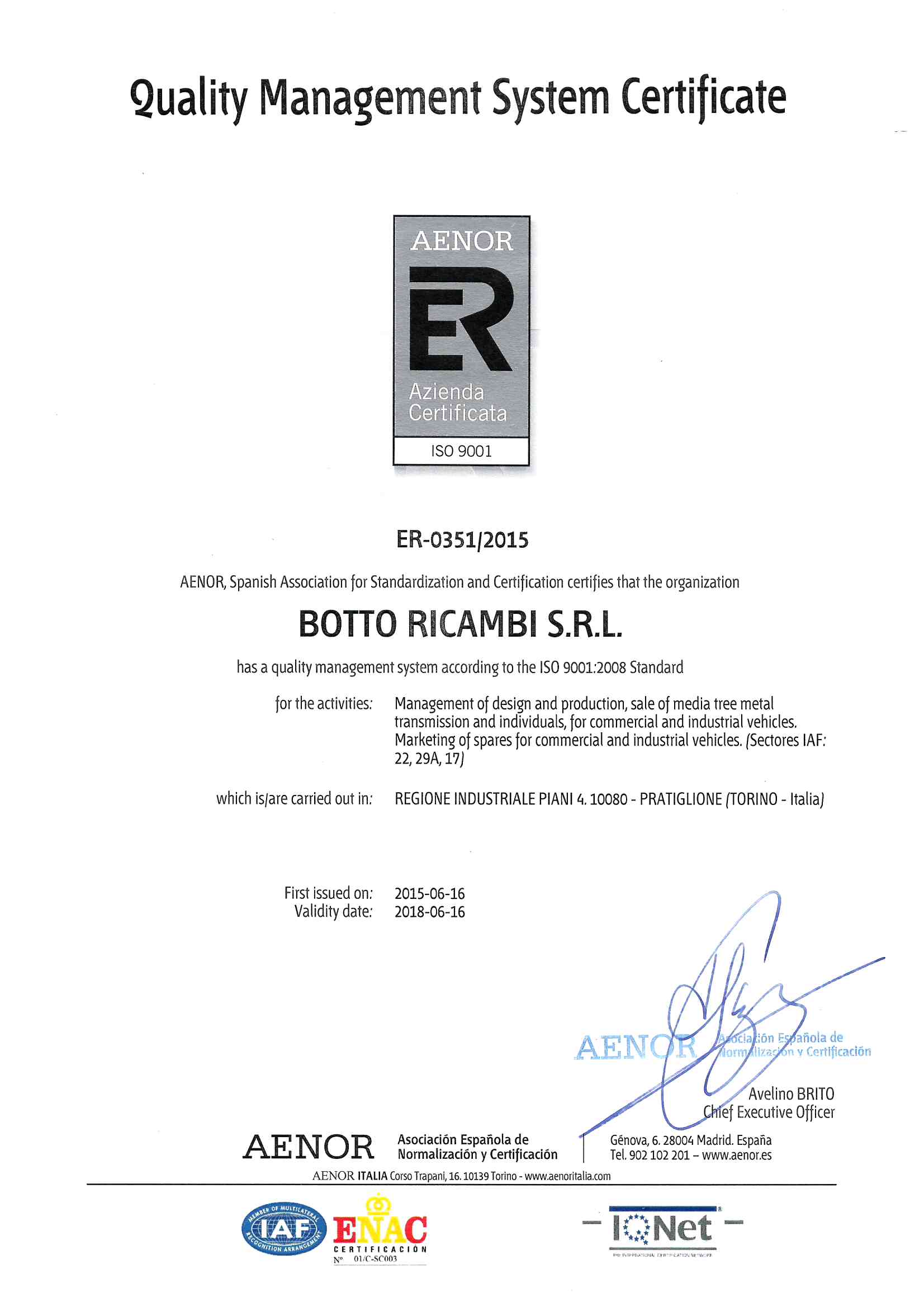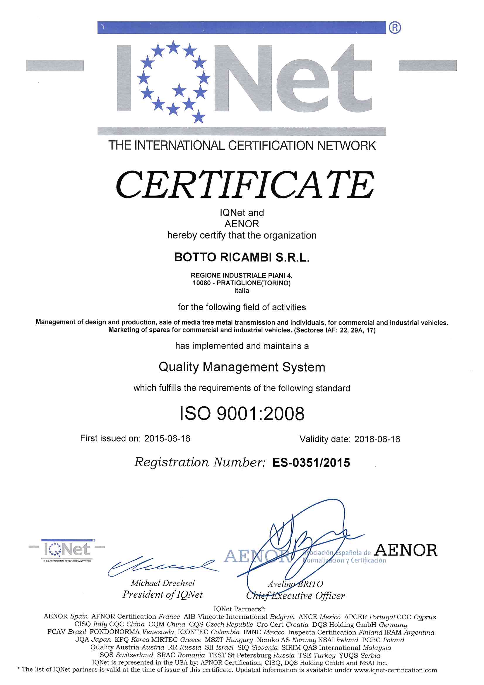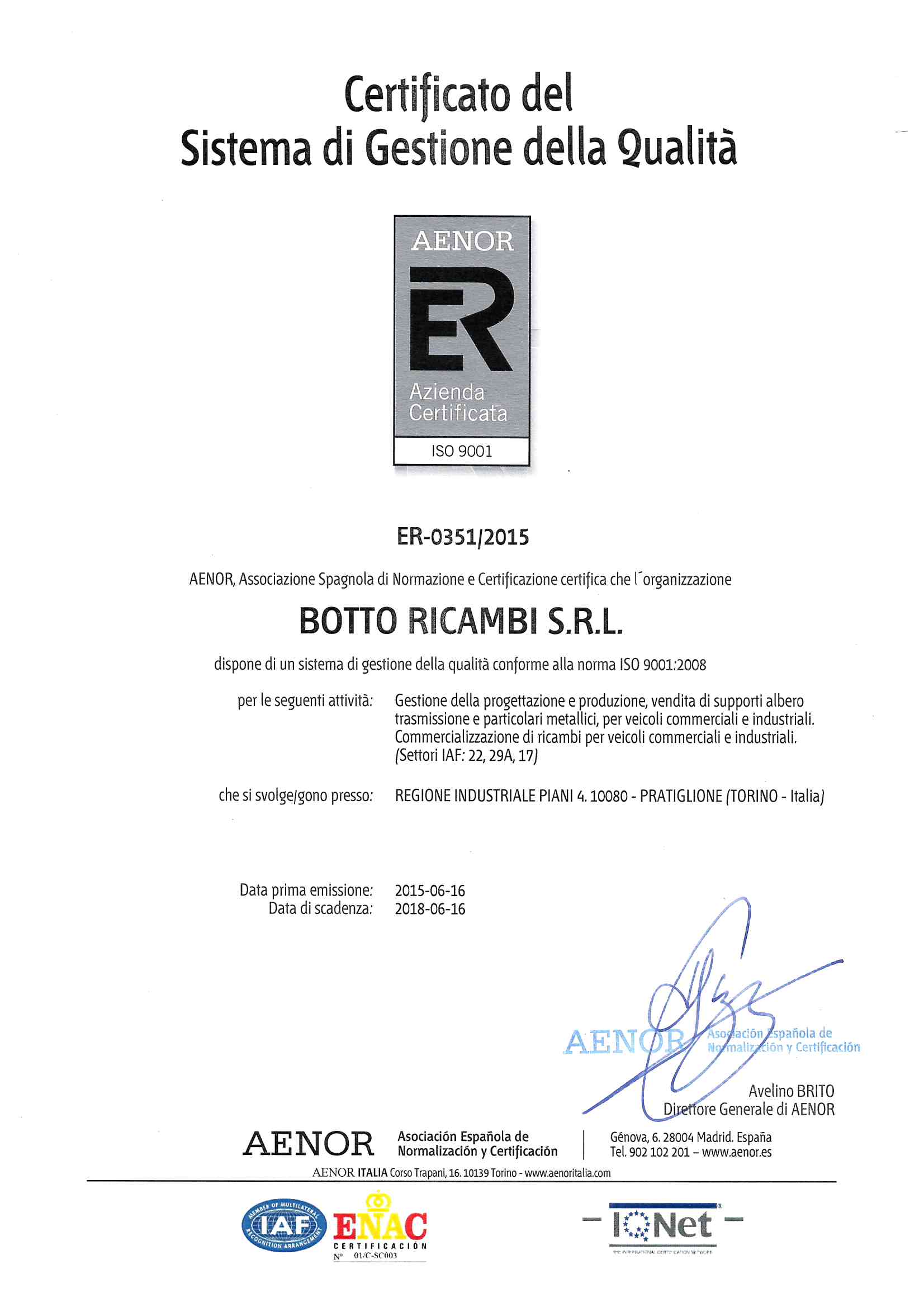 Il Sistema di Gestione per la Qualità della BOTTO RICAMBI S.r.l. è certificato secondo la Norma UNI EN ISO 9001 e lo scopo di certificazione copre le attività di gestione della progettazione e della produzione.